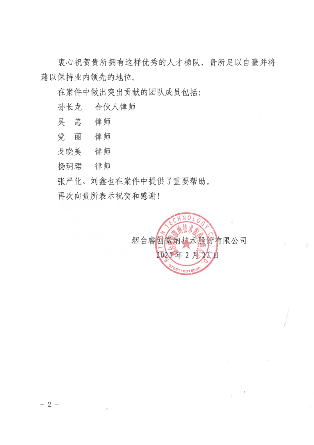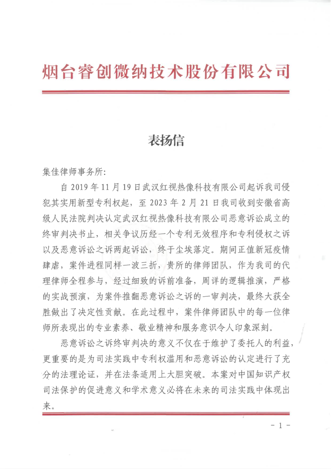 图1 睿创集团向亿万28寄送的表扬信
